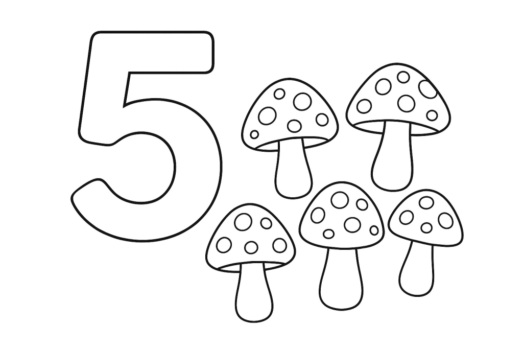 Приглашаем маленьких любителей природы и циферок в увлекательное путешествие в осенний лес! На этой раскраске вы найдёте крупную, дружелюбную цифру 5 и ровно пять очаровательных грибочков с белыми пятнышками на шляпках — идеальное сочетание для обучения сказочной математике.
