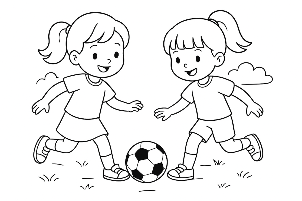 Представляем яркую и энергичную раскраску для самых маленьких футбольных фанатов — две улыбающиеся девочки с мячом на поле! Они бегут, смеются и весело играют в футбол — идеальный сюжет для развития творчества и любви к спорту.