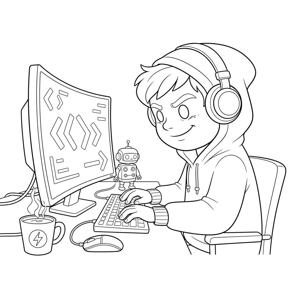 Эта раскраска прекрасно подойдет для развития мелкой моторики, усидчивости и творческого мышления. Ребенок сможет выбрать свои любимые оттенки для толстовки, монитора, робота и чашки с напитком. Используйте яркие фломастеры, чтобы выделить детали, мягкие карандаши для создания плавных переходов или краски, чтобы придать изображению живую текстуру. Проявите фантазию, раскрашивая фон и добавляя свои элементы.