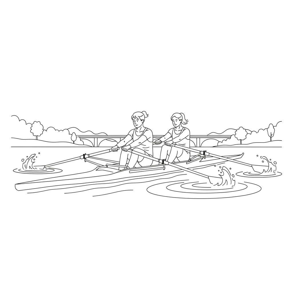 Эта раскраска изображает двух спортсменок, усердно тренирующихся в академической гребле на живописной реке. На заднем плане виднеется мост и пышные деревья, создающие атмосферу спокойствия и сосредоточенности. Девочки с азартом погружают вёсла в воду, поднимая брызги, что добавляет динамичности сцене.