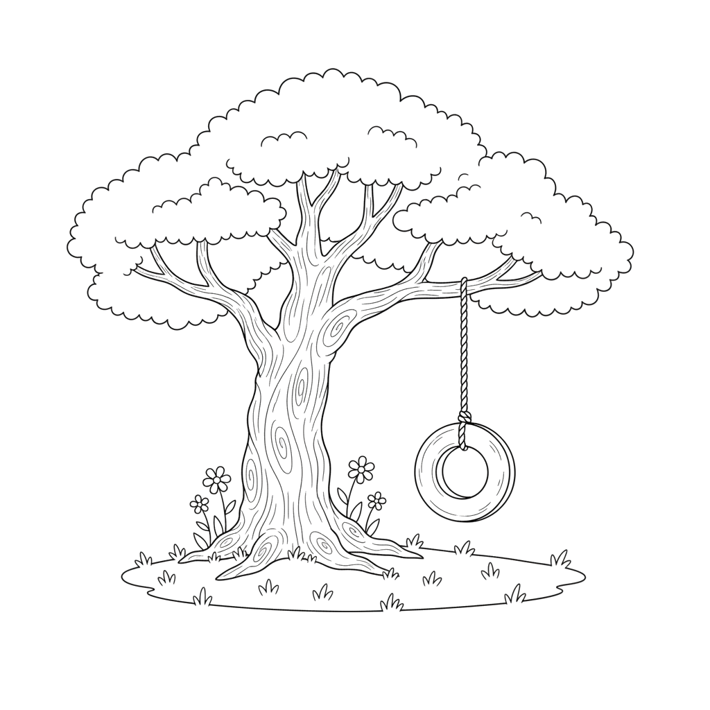 На этой чудесной раскраске изображено величественное дерево, которое так и манит поиграть. С одной из его крепких веток свисают самодельные качели из шины, приглашая маленьких художников окунуться в мир летних приключений. У основания дерева расцвели милые цветочки, а вокруг раскинулась зеленая трава, создавая идеальный пейзаж для творчества.