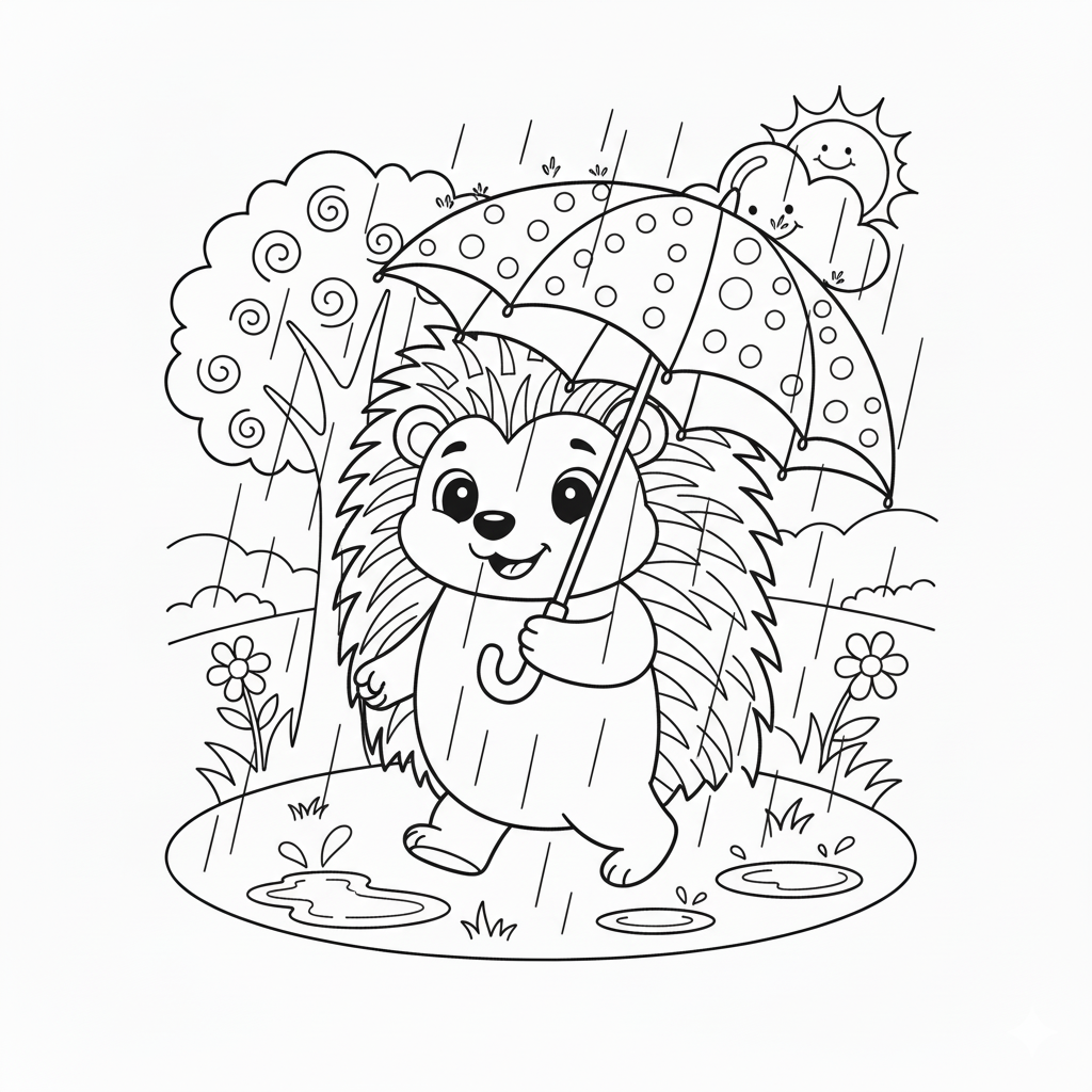 Раскраска «Ёжик под зонтиком в дождик» — весёлая и уютная сказка для маленьких художников 🌧️🦔☔