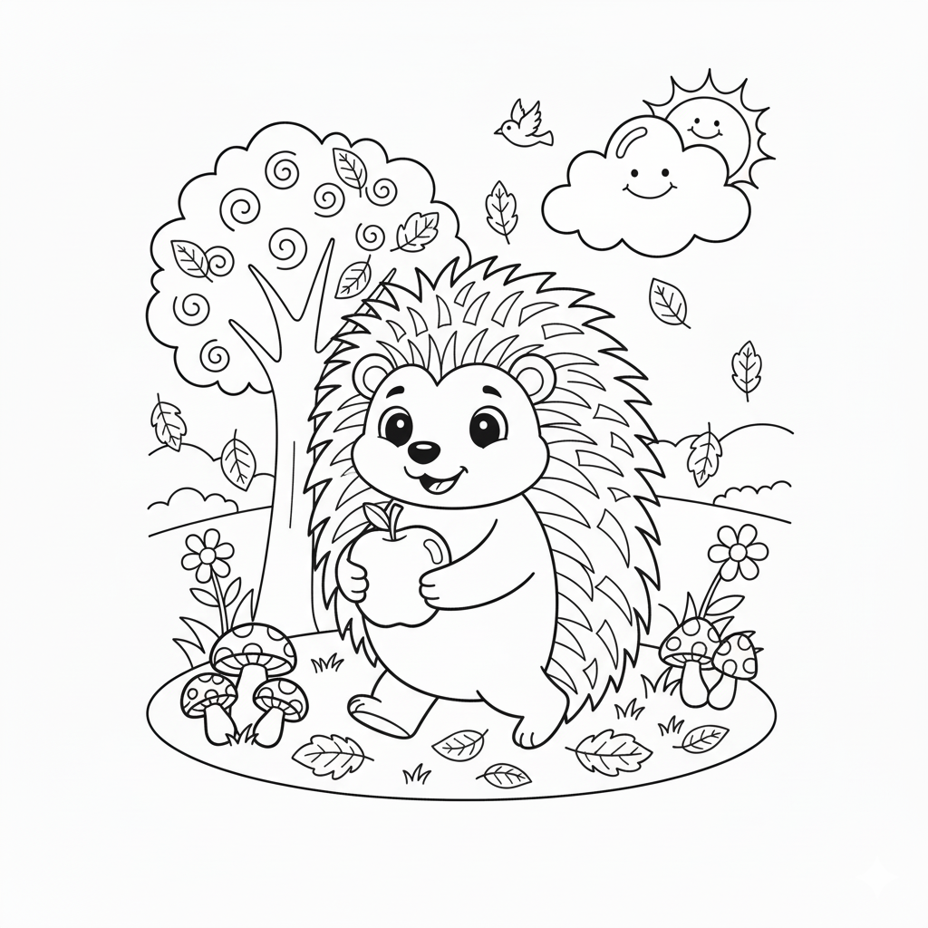 Раскраска «Ёжик в осеннем лесу с яблоком» — тёплая, уютная и волшебная сказка для маленьких художников 🍂🦔🍎