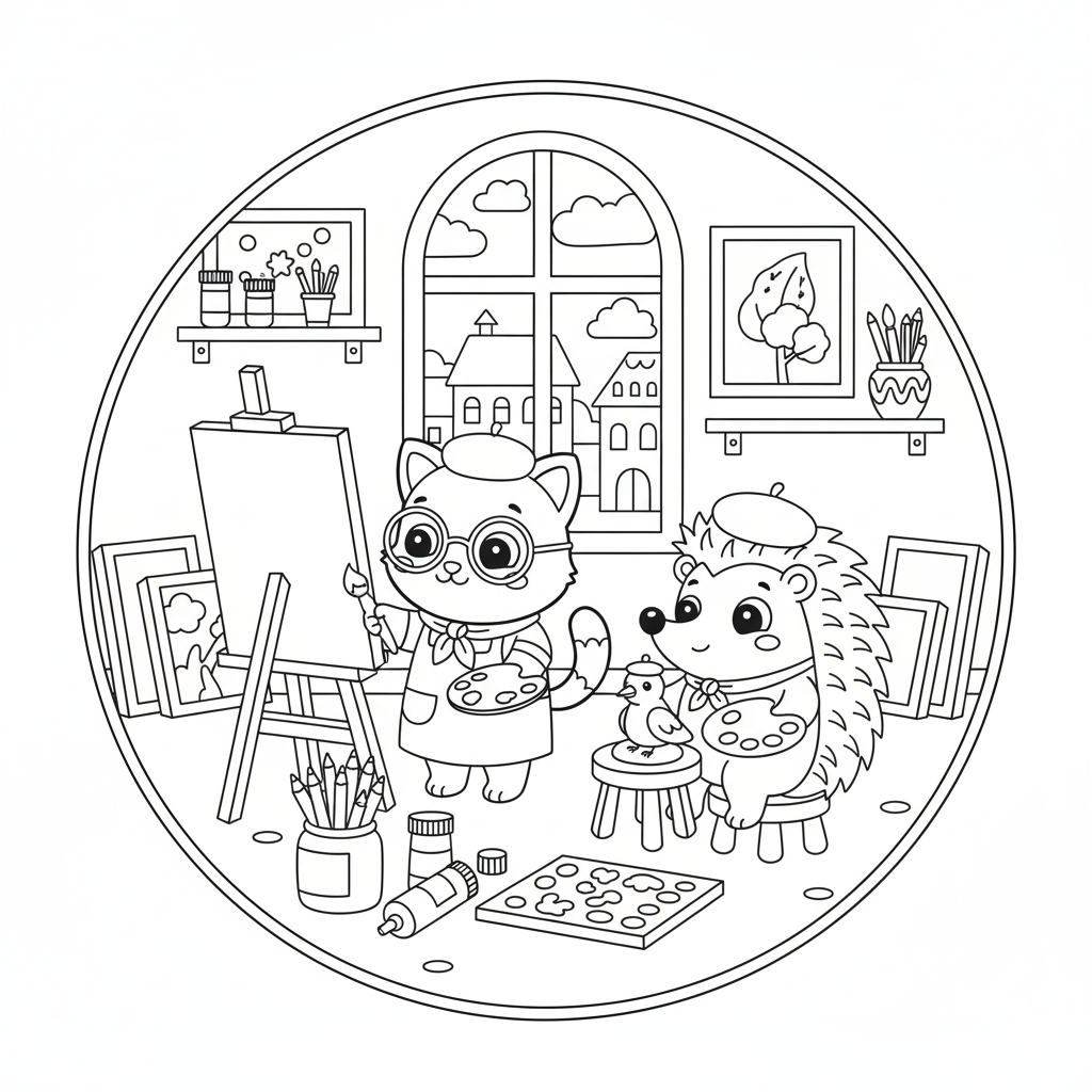 Представляем очаровательную раскраску: милый котёнок в очках и берете с кисточкой стоит у мольберта, а его друг — ёжик в берете — сидит на стульчике и рисует птичку. Вокруг них — художественная мастерская с красками, кистями, палитрами, картинами на стенах и даже видом на город из окна! Идеальный сюжет для развития творчества, воображения и любви к искусству.