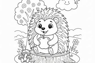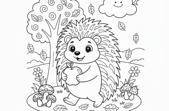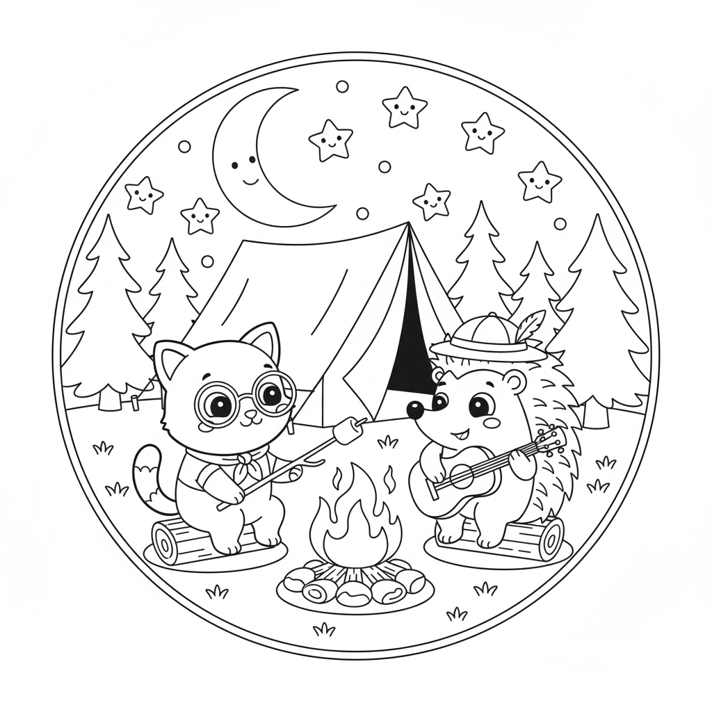 Представляем очаровательную раскраску: милый котёнок в очках и ёжик в походной шляпе сидят у костра в ночном лесу. Котёнок жарит зефир на палочке, а ёжик играет на гитаре — словно устраивая концерт под звёздами! На заднем плане — палатка, ели, улыбающаяся луна и сияющие звёзды с лицами. Идеальный сюжет для развития фантазии, любви к природе и дружбе!
