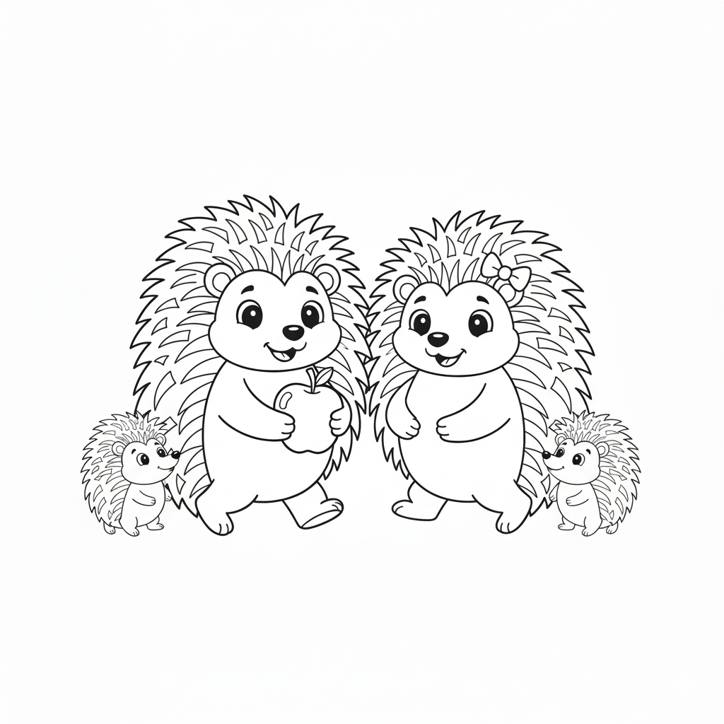 Представляем очаровательную и тёплую раскраску с целой семьёй ёжиков! Два больших ёжика — папа с яблоком в лапах и мама с бантиком — держатся за руки, а рядом с ними играют два маленьких ёжика-малыша. Всё как в настоящей семье: забота, улыбки и любовь! Идеальный сюжет для развития чувств, творчества и понимания семейных ценностей.