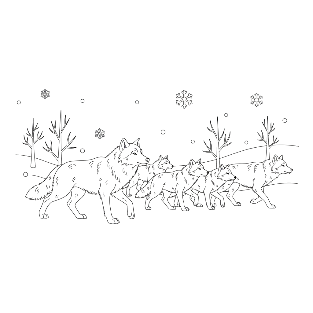 Для раскрашивания этой сцены можно использовать различные художественные материалы. Яркие фломастеры помогут выделить снежинки и придать четкость линиям, мягкие карандаши позволят создать реалистичные оттенки шерсти волков и нежные переходы в зимнем небе, а насыщенные краски сделают картину живой и выразительной. Экспериментируйте с текстурами и цветами, чтобы создать уникальное произведение искусства.