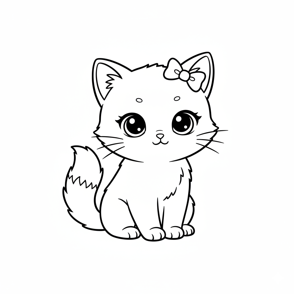 Представляем очаровательную раскраску: пушистый, сидящий котёнок с огромными выразительными глазами, ласковой улыбкой и милым бантиком на ушке. Его мягкие лапки, пушистый хвост и добрые щёчки создают атмосферу уюта и нежности — идеальный образ для спокойного, доброго занятия с ребёнком.