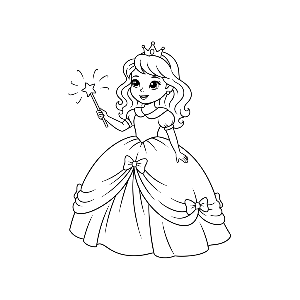 Приготовьте свои любимые фломастеры, яркие карандаши или акварельные краски! Дайте волю своему воображению, выбирая самые красивые оттенки для платья принцессы, сияния ее волшебной палочки и блеска короны. Пусть каждый элемент картинки засияет новыми цветами и превратится в произведение искусства.