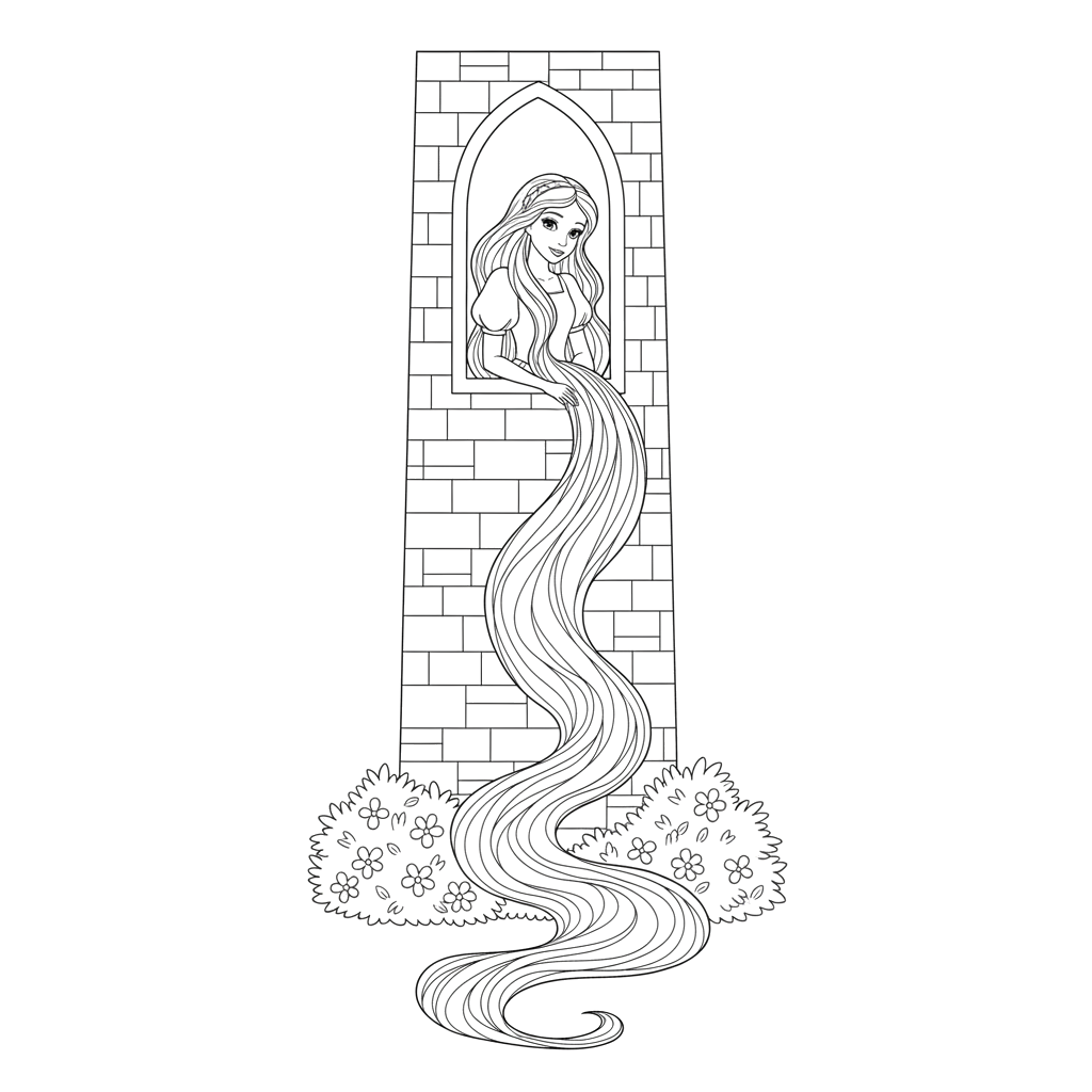 Малышу предстоит оживить этот чудесный сюжет, выбрав яркие цвета для платья принцессы, кирпичей башни и зелени вокруг. Можно использовать фломастеры, чтобы сделать изображение более контрастным, или краски для создания мягких переходов и объёма. Карандаши помогут проработать мелкие детали в волосах и лепестках цветов, придав картинке особую изящность.