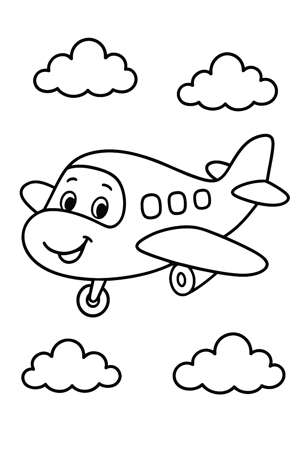 На этой раскраске изображён мультяшный самолёт с доброй улыбкой, летящий среди пушистых облаков. У него округлое тело, большие окна, крылья и хвост — всё прорисовано простыми чёрными линиями, удобными для раскрашивания.